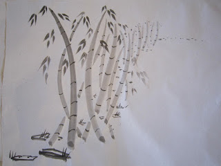 We started the day with a meditation on the 5 senses to tune us into the vibration of the space and to ground us to this timeless land of Terra Australis and its dreamtime infused lines of song which tweek and twitter every nook of this ether we call ....the environs. After introducing our materials and giving a context to the Zen experience..... with a capital E .....the days focus was on Bamboo as we traversed the subtleties of the leaf, the trunk, the join in the trunk and the branches, all of which require a unique stroke. Although visually easy to watch, a zen artist is irritatingly difficult to imitate at first. (Take 5 years to prove to yourself that "I can paint a leaf as well as that B.................., another 5 to get used to sitting straight without turning to jelly after 2 hours, and another 5 years where the joy starts to smack you like a LSD pill and you don't want to stop.) As circles led to lines and lines led to small dots on white paper the day fell into a timeless miasmic dream.....the type of dream that is like that cold beer that one yearns for on a 45C heatwave....the one swish which you never want to end or even hit the wall of your belly. After a late lunch and reviving cup of tea and biscuits we ( the man with the grey beard ) was given the challenge of turning a leaf into a fish. mmmm? By this time it was clear the magic had worked and anything was seeming to be possible from the crowd. I pondered for 2 seconds and thought...'if the man from Galilee could do this stunt 2k plus years ago and come up with loaves and fishes from the void then maybe the 'light' was in me. With a palpable hummm in the air, IT WAS ON........Although nobody would ever admit it nor even whisper the dream of it ......all in the room were thinking......'this sod has got us in a state of mental humiliation and nervous paralysis after 4 hours of this Zen stuff and now HE IS GONNA SINK. In front of a group of peaced out onlookers hooked on the magic of Zen the brush began to move across the page .....one stroke for the body, seemingly a leaf shape, then another for the other half of the body joined and then a body and a head of a dolphin like fish emerged, a few swishes more and the tail fin is done and then the eye of the fish and then the gentle touch of the fins. Whooo Ahhhhh and there was a wave of joy that burst out of a mountain of expectation. The deed was done. A leaf into a fish.